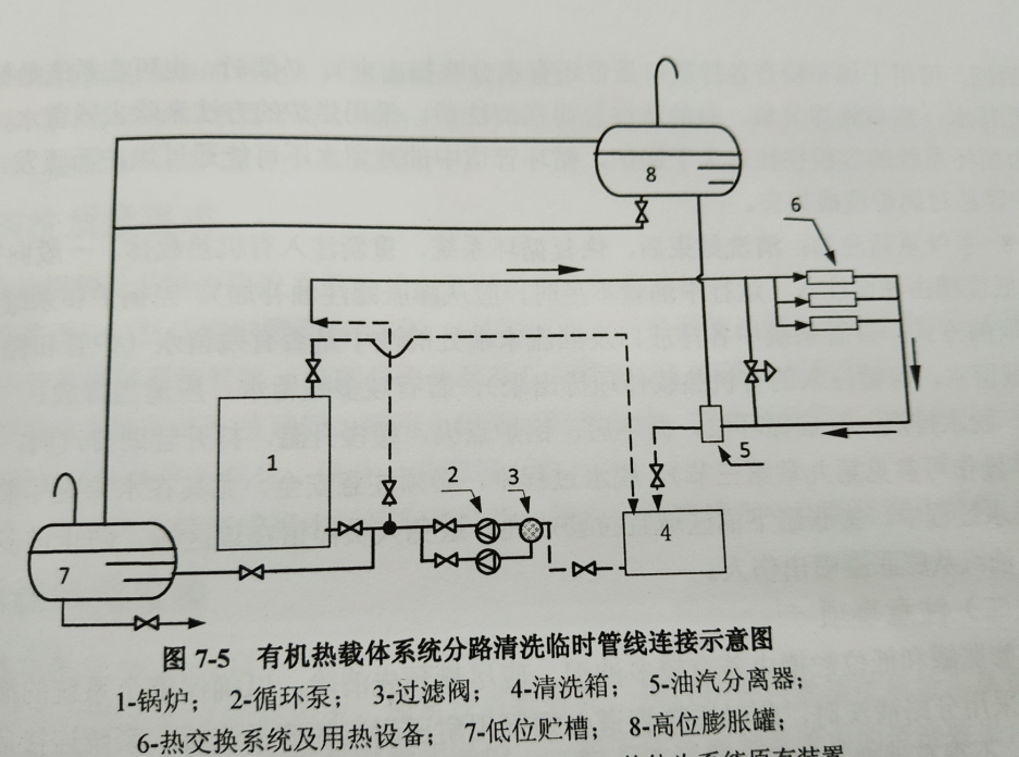 一般若導熱油劣化程度不高,殘?zhí)亢砍瑯瞬欢?,爐管內(nèi)結(jié)焦、結(jié)炭不嚴重,可以不另外設置清洗系統(tǒng),利用系統(tǒng)原有的循環(huán)泵和循環(huán)管路即可進行清洗。但如果殘?zhí)亢枯^高,爐管內(nèi)結(jié)焦、結(jié)炭較嚴重,為了避免將鍋爐中清洗出來的結(jié)焦物和炭垢等固體雜質(zhì)帶到熱交換系統(tǒng)中,防止熱交換系統(tǒng)支路小口徑管道堵塞,宜設置分路臨時清洗系統(tǒng),將鍋爐和熱交換循環(huán)系統(tǒng)分開進行循環(huán)清洗。分爐清洗臨時管線的連接可參見圖7-5的示意:分別拆開循環(huán)泵出口閥和鍋爐出口閥,加裝三通、閥門、臨時連接管線和清洗箱,其中清洗箱出口連接循環(huán)泵入口;循環(huán)泵出口裝設三通,一路連接鍋爐入口,另一路用臨時管道連接與鍋爐出口斷開后的循環(huán)系統(tǒng)管路;鍋爐出口和循環(huán)系統(tǒng)回流至清洗箱(循環(huán)系統(tǒng)入口和回流管分別加裝閥門),必要時可在清洗箱出口增設過濾網(wǎng)或過濾閥,避免鍋爐清洗出來的結(jié)焦物和垢渣等固體雜質(zhì)進入循環(huán)清洗系統(tǒng)。